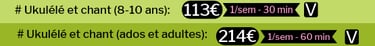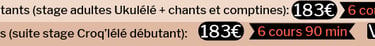 6 cours de 90 min = 183€ (Croq'lélé débutant => comptines)